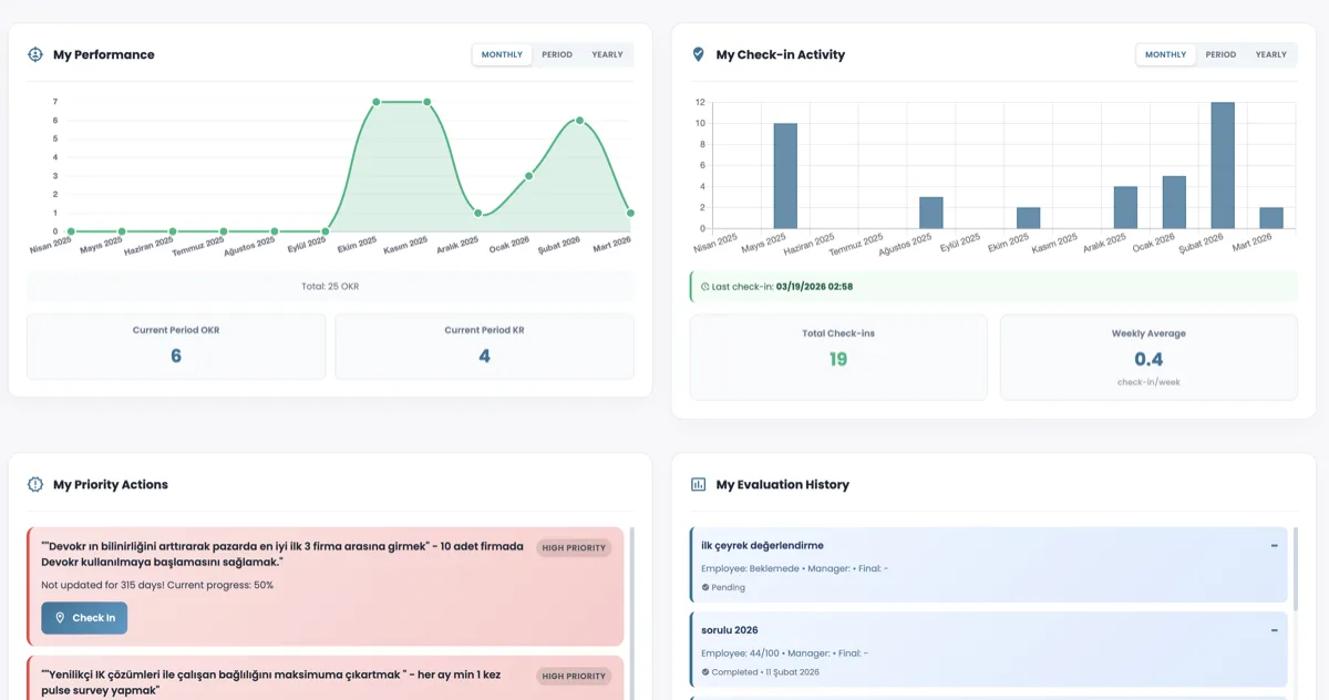 - Performans değerlendirmeleri ve bağlılık anketleri ile entegre kademeli OKR hizalaması